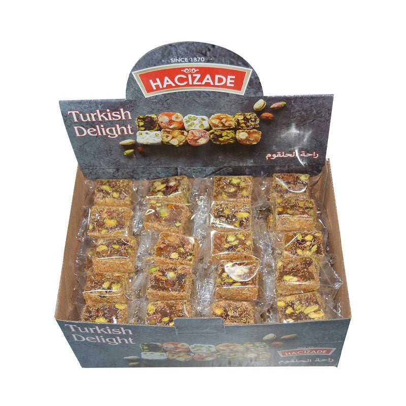 Hacizade Turkish Delight with Kadayif and Pistachio is the sweet you've been waiting for! Packed with flavour, the delicious flavour of kadayif's syrup sugar taste, pistachio and the rosewater jelly of turkish delight, will make your taste buds go wild. This 2 Kg box of Hacizade Turkish Delight from Turkey is ideal for sharing a sweet treat with friends or pampering yourself at home.